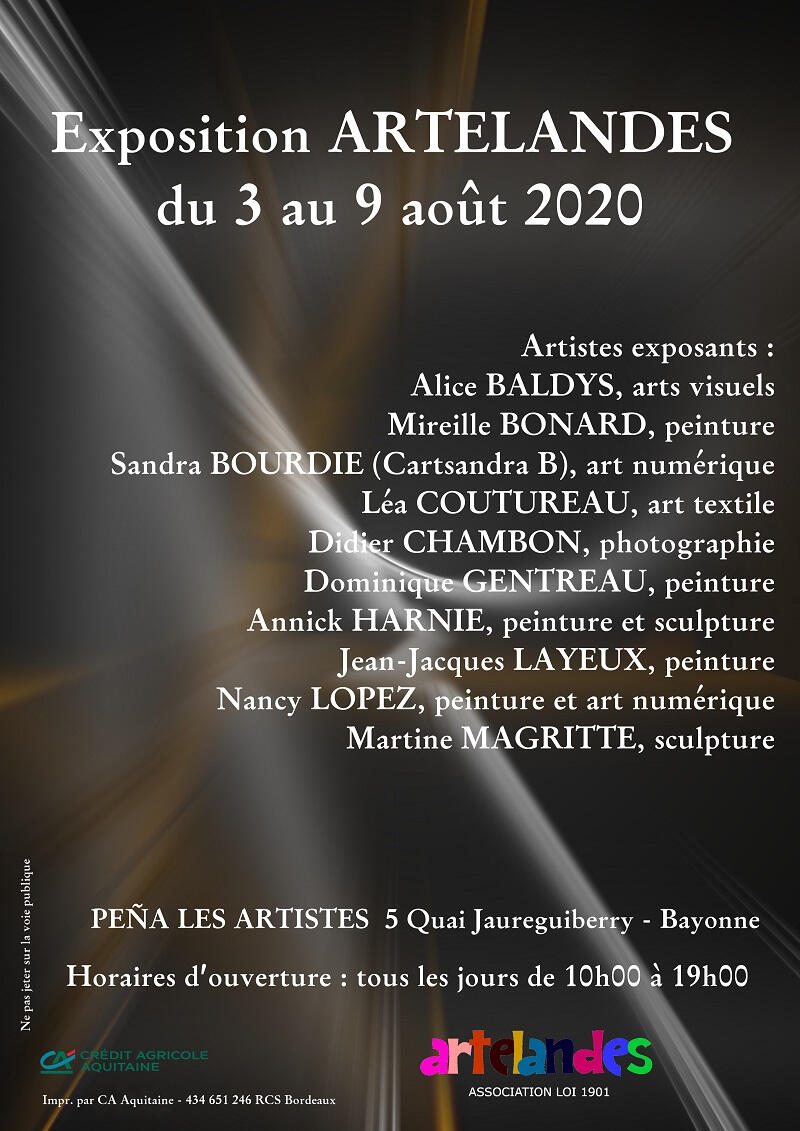 2020/08Exposition avec le collectif ArteLandes à la "Peña les Artistes", Bayonne (64). Présentation de la “Série Safety“, avec les artistes: Alice Baldys / Mireille Bonard / Sandra Bourdie / Dominique Gentreau / Annick Harnie / Nancy Lopez / Didier Chambon / Léa Coutureau / Martine Layeux / Jean-Jacques Layeux.