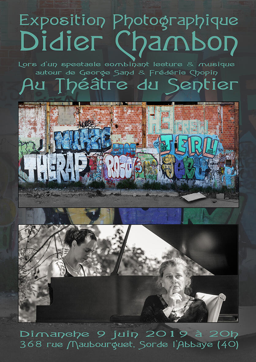 Exposition de la série “Corps et Graffiti“, lors d'un spectacle combinant lecture et musique autour de George Sand & Frédéric Chopin. Présenté par l’association “La Scène Déménage" au Théâtre du Sentier à Sorde-l’Abbaye (40).Exposition du 9 juin 2019