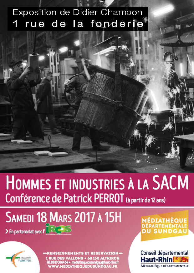 2017/03Exposition de “1 rue de la Fonderie“ et conférence « Hommes et Industrie à la SACM“. Médiathèque départementale du Sundgau à Altkirch (68). Exposition et conférence à partir du 18 mars.Exposition du 18 mars au 16 avril 2017