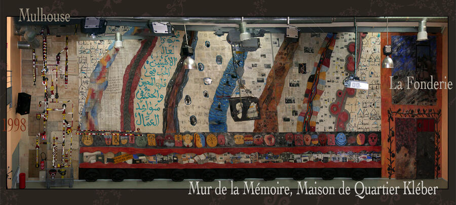 1998/11Réalisation du “Mur de la Mémoire” (8 m x 25 m) dans la maison de quartier Kléber à Mulhouse, fresque collective en partenariat avec l’association “ Arter Ensemble “ et Luis Pasina, plasticien en résidence dans ce lieu (68).