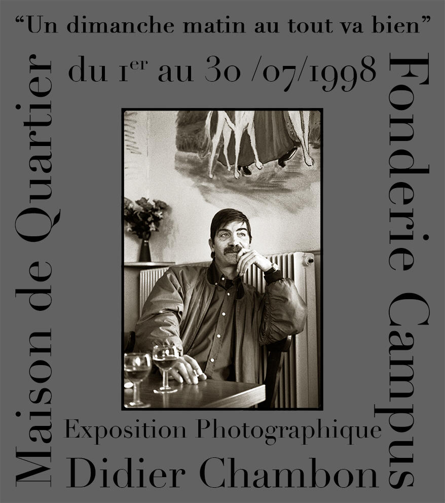 1998/07Présentation à Mulhouse de la série “Un dimanche matin au tout va bien” dans la galerie de La Maison de Quartier de la Fonderie Campus (commande de la ville de Mulhouse) (68).Exposition du 1 au 30 juillet 1998